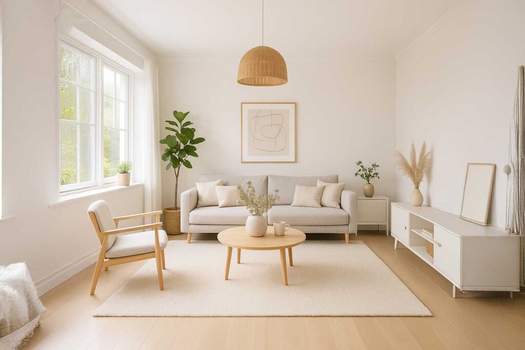無垢材の床とグレーのアクセントクロスが、シンプルながらも上質な空間を生み出しています。